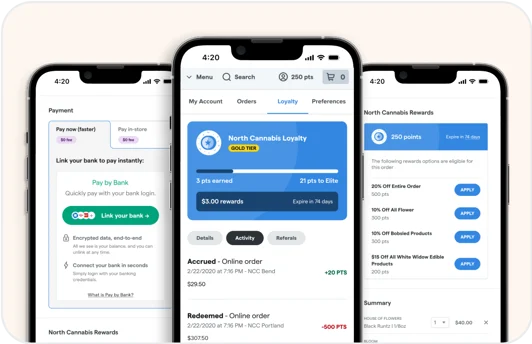 Streamline the customer experience, Dutchie Pay by Bank now integrates directly with Loyalty, Marketing, and the Mobile App.